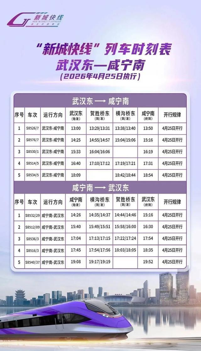 武咸城际“新城快线”依托既有武咸城际铁路,连接武汉东站、贺胜桥东站、横沟桥东站、咸宁南站,运营全程80公里,旅行时间45分钟。光谷至咸宁温泉景区缩至1小时。票价21元,较高铁便宜18元。乘客无需对号入座,出站自动扣费,真正实现“随到随走”。